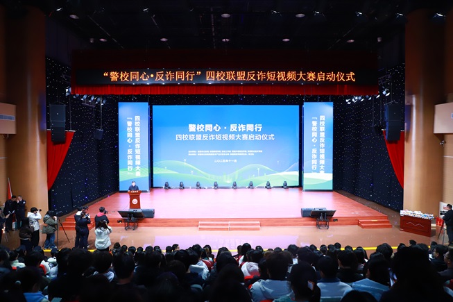 11月20日晚,安阳市“警校同心·反诈同行”四校联盟反诈短视频大赛在我校明园校区演播厅正式启动。安阳市公安局党委副书记、常务副局长程宏涛,市公安局党委委员、副局长常勇,我校副校长杨新宇,安阳工学院副校长王振宇,河南护理职业学院副校长常慧敏,安阳职业技术学院校长助理马智明,市公安局高新分局负责人,安师、安工、河护、安职四所高校的学生处、保卫处负责人以及学生代表等共350余人参加活动。