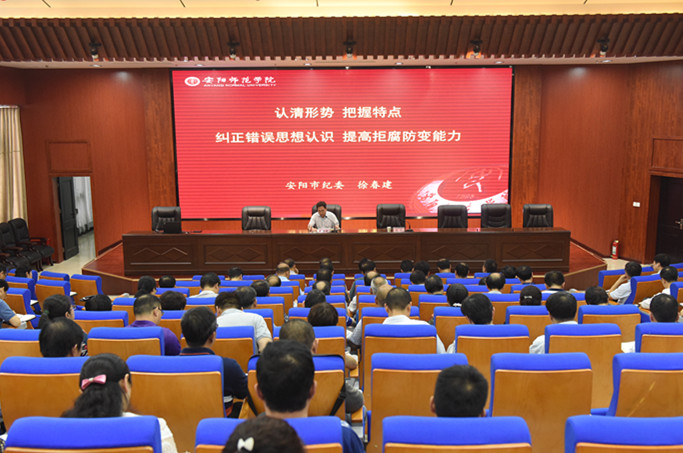 安阳市纪委、监委正处级纪检监察员徐春建以“认清形势,把握特点,纠正错误思想认识,提高拒腐防变能力”为题作专题报告。结合大量典型案例和详实数据,徐春建深入分析了党的十八大以来全国、全省及安阳市反腐败斗争形势和特点,就如何提高拒腐防变能力谈了自己的认识。他指出,要深入学习贯彻习近平新时代中国特色社会主义思想,增强“四个意识”,坚定“四个自信”,做到“两个维护”,努力加强党性修养,始终保持清醒头脑,以如临深渊、如履薄冰的心态,时刻绷紧纪律法律这根弦,一刻不放松地搞好党风廉政建设。