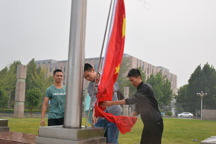 狂风刚起时,校国旗班成员、物理与电气工程学院2016级学生翟浩楠正在和鸣楼6楼教室学习。当看到外面天色逐渐变暗、树木晃动的厉害,他起身就往楼下跑。刚到楼下,雨就大了起来。跑到文鼎广场西侧,翟浩楠远远看到狂风中国旗被卡在了旗杆中部,一路“狂奔”到旗杆下,他的绿色上衣已经完全被雨淋透,雨水顺着脸颊往下淌。顾不得擦拭,他马上调试升降器,试图把国旗重新升起来。