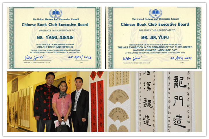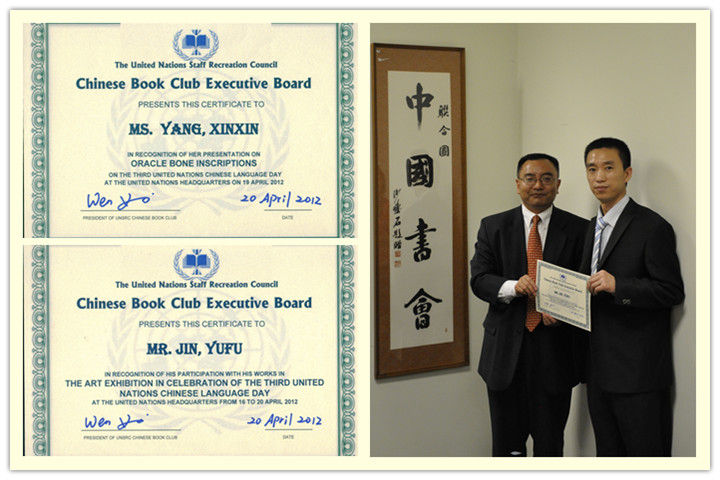 “中文日”活动结束后,联合国向我校发来了热情洋溢的感谢信。联合国中国书会向杨新新教授、金玉甫博士分别颁发了证书,感谢他们为“中文日”活动作文化专题讲座、创作书法作品。